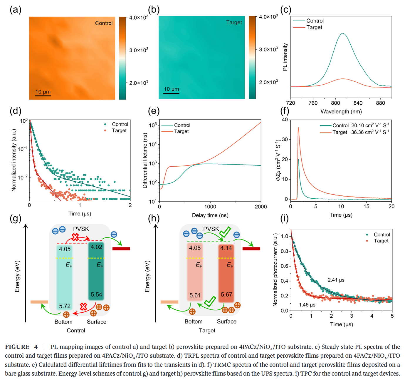 经过HFPN调控后的钙钛矿薄膜结晶度更高、表面粗糙度更低,界面和体相缺陷得到明显抑制。PL与TRPL结果显示,薄膜非辐射复合显著减少,平均载流子寿命明显延长,顶部与底部激发的发光峰几乎重合,印证了A位阳离子的均匀环境。SCLC测试表明陷阱态密度大幅下降,DFT计算也显示关键缺陷的形成能被明显抬升。