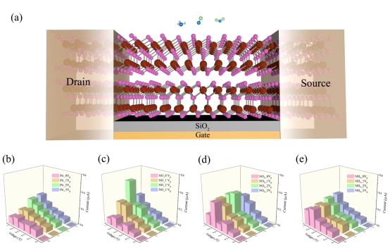 Figure 3. Schematic diagram of a FET-type gas sensor based on bilayer In2Se3. (b-e) I-V curves of gas sensors based on bilayer In2Se3 detecting NO, NO2, and NH3 molecules under different gate voltages