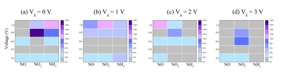 Figure 4. The variation patterns of sensitivity for NO, NO2, and NH3 adsorption systems under different gate voltages (Vg) as a function of bias voltage (Vb).