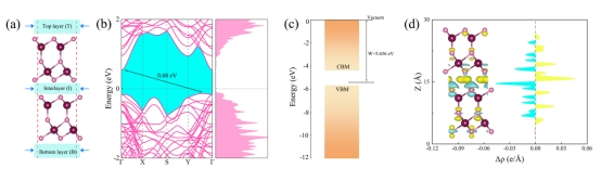 Figure 2. (a) Side view of the A2-stacked bilayer In2Se3, with labeled gas adsorption sites. (b) Band structure, DOS and (c) band alignments of bilayer In2Se3. (d) DCD and plane-averaged charge density difference of bilayer In2Se3