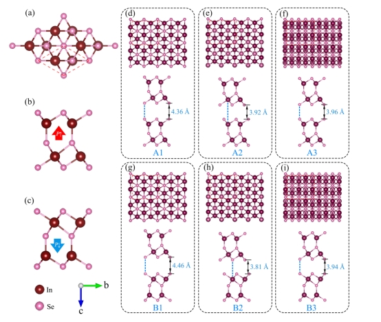 Figure 1. (a) Top view of a 2 × 2 supercell of In2Se3 with molecular adsorption sites. (b, c) Side views of the P↑ and P↓-states of In2Se3. (d-i) Bilayer In2Se3 structures with different stacking configurations.