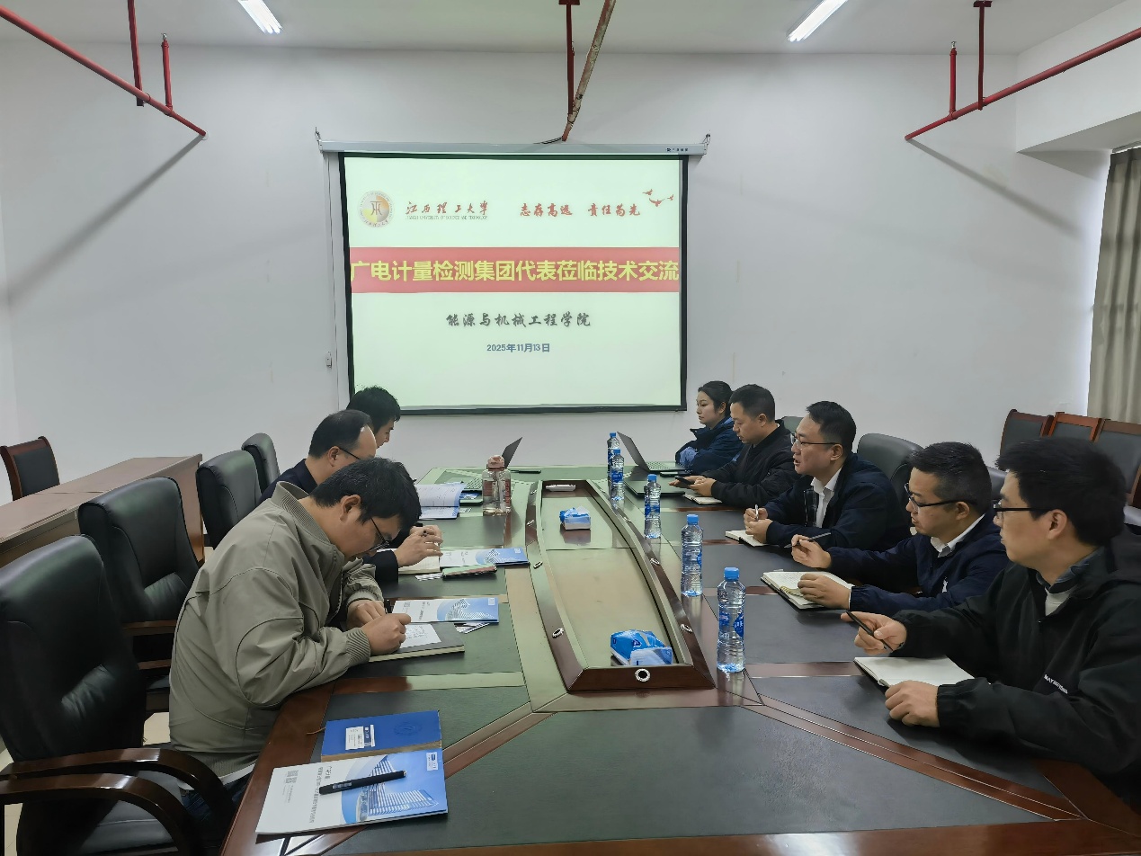 本网讯 为打通高校科研与产业应用的衔接通道,推动计量检测技术与能源机械领域深度融合创新,11月13日,江西理工大学能源与机械工程学院与广电计量检测(江西)有限公司联合举办技术交流座谈会。学院副院长许梁、党政办公室主任肖斌、能源动力研究所所长戴书琪、能源与物理系副主任龚程出席会议,江西广电计量党支部书记、总经理韦忱带队,携计量校准、可靠性测试、新能源检测、化学检测等领域专家团队参会交流。