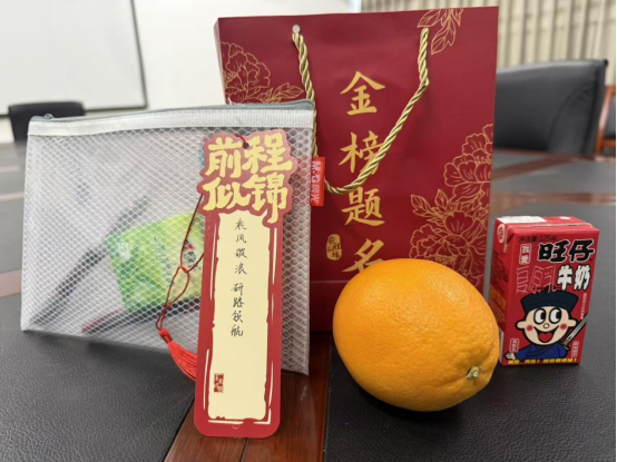 就业辅导员曾亮亮为大家介绍慰问礼包的美好寓意,里面包含了考试必备的文具袋,脐橙、旺仔牛奶、书签祝福语,希望我院学子心想事“橙”,在考研中运气旺旺。