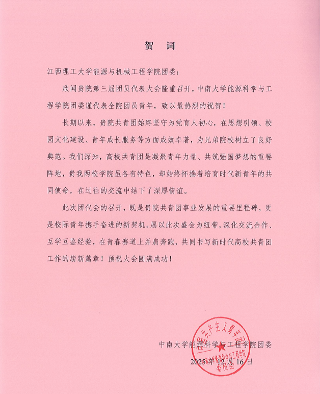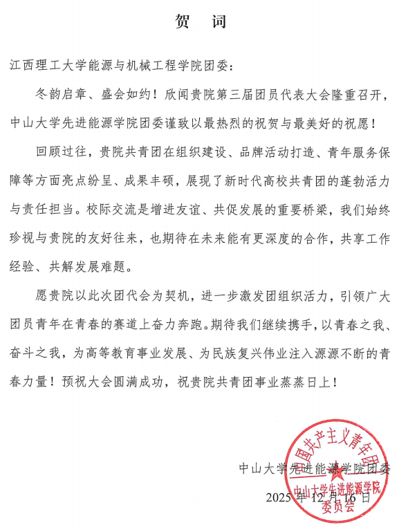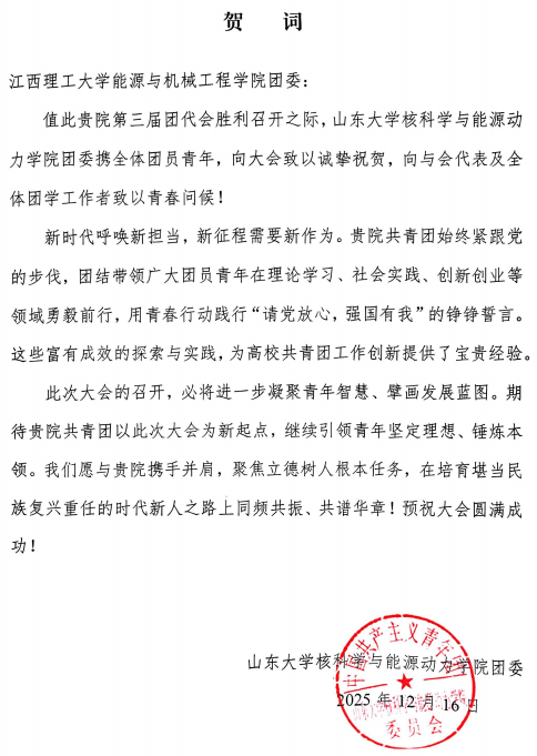 在大会开幕式上,山东大学核科学与能源动力学院、中南大学能源科学与工程学院、中山大学先进能源学院、南昌校区软件工程学院和商学院等兄弟院校团委发来贺信,对大会的召开致以热烈祝贺,未来将深化友谊,继续携手并肩、砥砺前行,共同谱写共青团事业的新篇章。