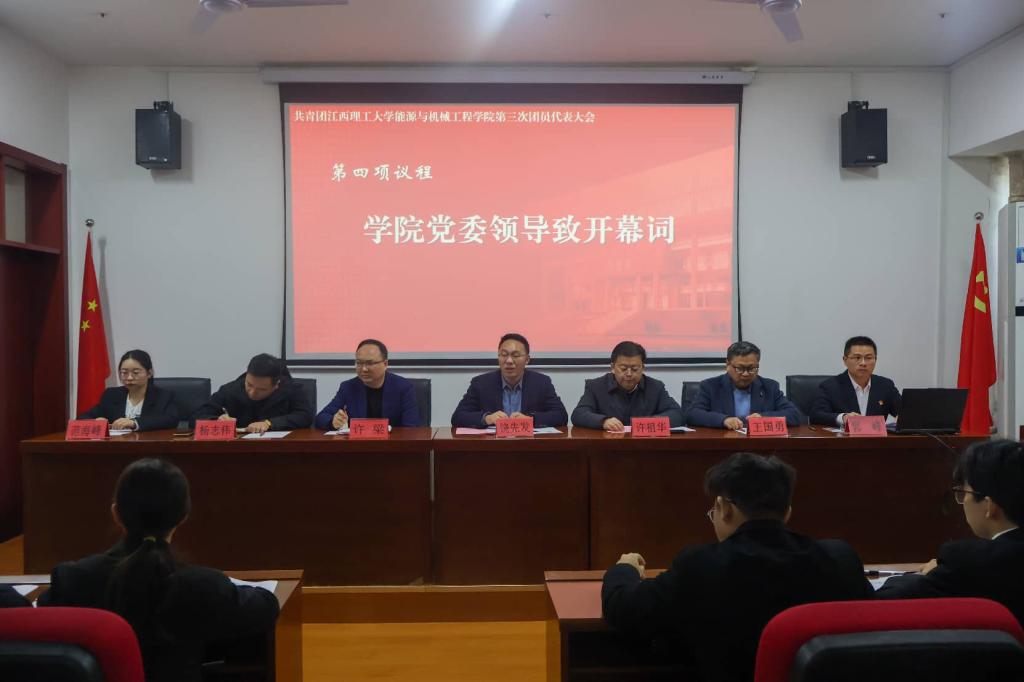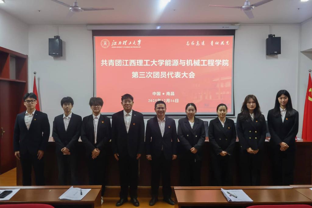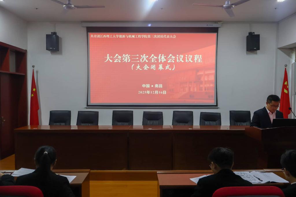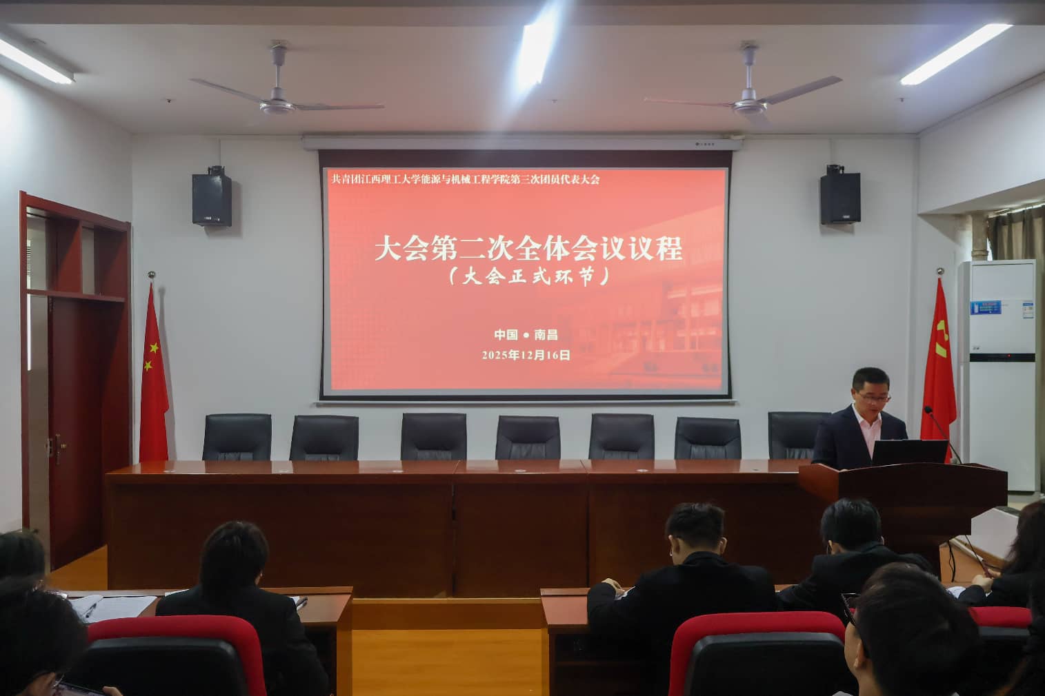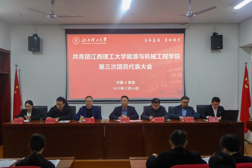 本网讯 2025年12月16日,共青团江西理工大学能源与机械工程学院第三次团员代表大会在南昌校区综合实验大楼 A1101隆重召开,庄严的国歌拉开了大会的帷幕。参与此次会议的有学院党委书记饶先发,南昌校区管委会副主任许祖华,学院副院长许梁,学院学生工作负责人王国勇,南昌校区团工委书记杨志伟,学院团委书记郭峰,学院专任教师、2025级研究生团支部书记范海峰,学院兼职辅导员朱晨曦,同时与会的还有学院研究生、本科生团支部的86名团员代表代表。