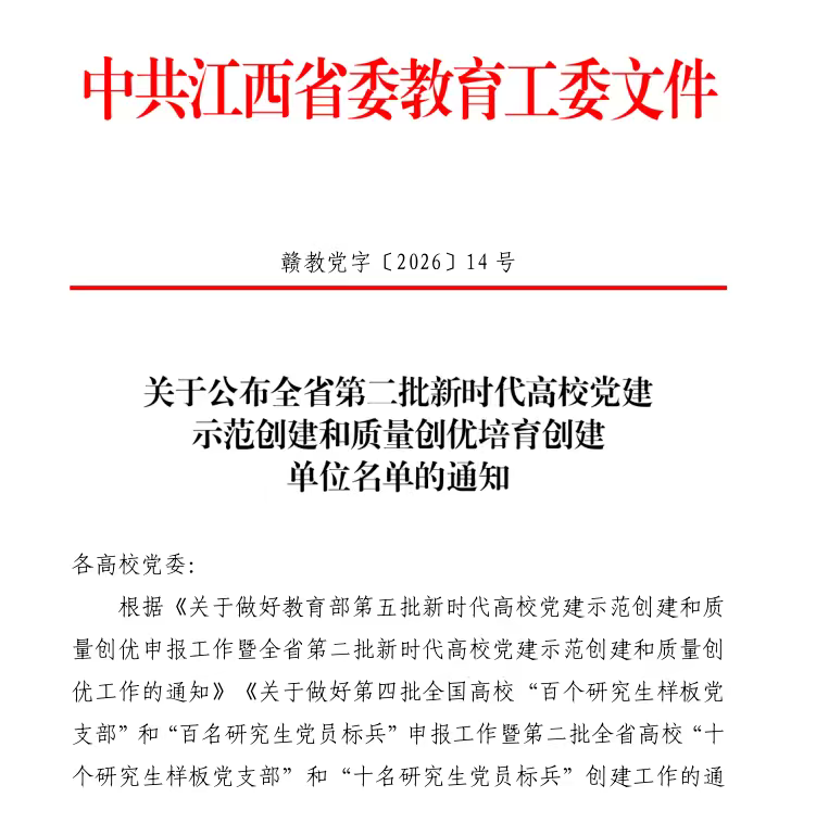 近日,中共江西省委教育工作委员会公布了第二批全省党建“双创”工作培育创建单位名单。江西理工大学能源与机械工程学院研究生党支部凭借扎实的党建基础和突出的工作成效,成功入选“全省党建工作样板支部”培育创建单位。这一重要成果标志着我院基层党建工作迈上新台阶,也为学院党建工作高质量发展注入了新动能。 我院研究生党支部以“聚能环”为核心引领,聚焦“铸魂、强基、砺能、躬行、树帜”五大关键领域,锚定国家关键矿产绿色开发与生物增材制造两大交叉学科产业升级战略需求,着力打造“红心聚人·先锋聚能”党建工作品牌(“红心聚人”即依托红色资源凝聚党员思想共识,“先锋聚能”即通过先锋引领激活科研、服务、育人动能)。在此基础上,支部创新构建“五环”党建工作体系,与“七个有力”形成逻辑闭环,推动党建引领与国家战略深度融合,确保组织建设有方向、党员教育有深度、服务发展有实效。 在“五环”体系的系统推进下,支部紧紧围绕国家战略需求,持续深化“党建引领—协同育人—事业发展”一体化长效机制,扎实开展红色铸魂、科研攻坚、结对帮扶等系列实践活动,充分发挥基层党组织战斗堡垒作用和党员先锋模范作用,引导全体成员自觉践行“爱国、励志、求真、力行”和“勤学、修德、明辨、笃行”的成长要求,努力成长为“六有大学生”。支部始终以“有理想、敢担当、能吃苦、肯奋斗”的新时代好青年为培养目标,推动学生成长与国家关键矿产绿色开发、生物增材制造等产业发展深度融合,积极服务中国式现代化建设,持续为党和国家输送政治素养过硬、学术能力突出、战略担当自觉的复合型人才。 此次获批“全省党建工作样板支部”,不仅是对我院研究生党支部长期建设成效的充分肯定,更是学院基层党建工作的重要突破。站在新起点,我院研究生党支部将不忘初心、牢记使命,持续强化政治引领,深化党建与业务融合,不断提升组织力、凝聚力和战斗力,努力建设成为政治坚定、作用突出、师生认可的坚强战斗堡垒,为学校、学院高质量发展汇聚更加强劲的红色动能!